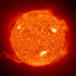 Esta imagem foi feita pela Skylab, a estação espacial da NASA, em 19 de Dezembro de 1973. Mostra uma das mais espectaculares chamas solares alguma vez registada, afastando-se do Sol, propulsionada por forças magnéticas. Estende-se por mais de 588,000 km (365,000 milhas) da superfície solar. Nesta fotografia, os polos solares distinguem-se por uma relativa ausência de granulação, e uma tonalidade muito mais escura do que na parte central do disco. (Cortesia NASA)